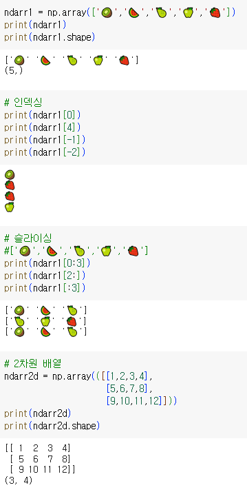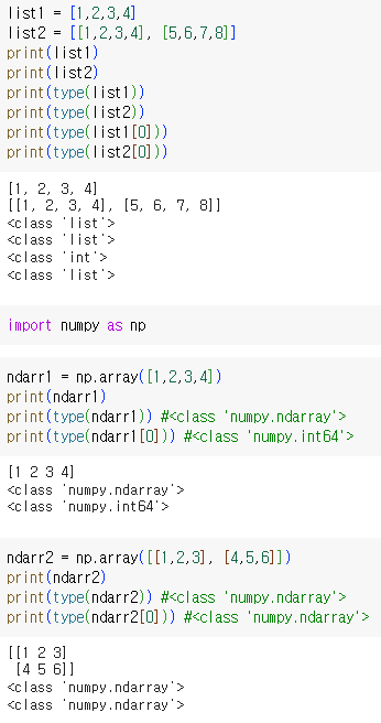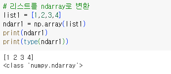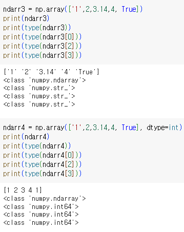 - ndarray는 동일한 자료형을 가지는 원소들로 이루어죠 있음