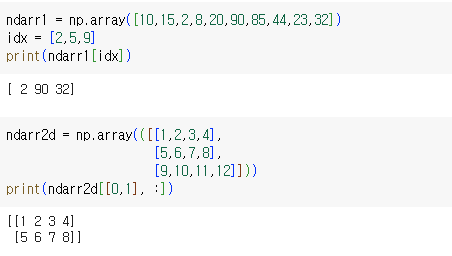 - 정수 배열이나 불리언 배열을 사용하여 배열의 일부를 선택하는 방법