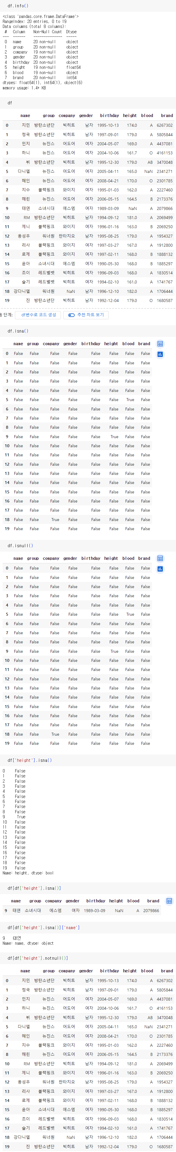 - 비어있는 값, 판다스에서는 NaN(Not a Number)로 표기 된 것은 모두 결측값으로 취급