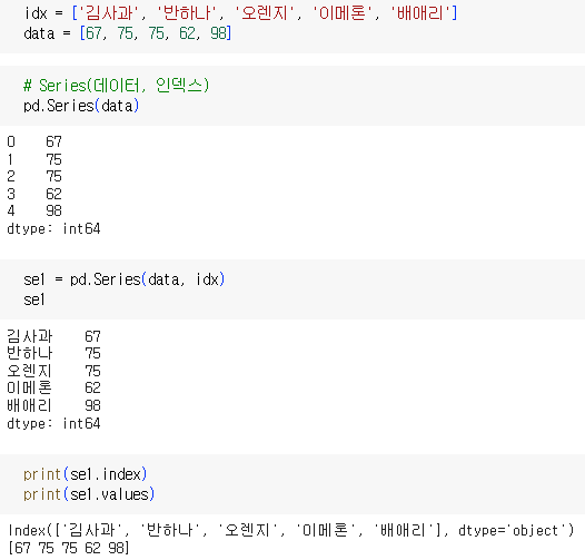 - Series의 각 요소는 인덱스(index)와 값(value)으로 구성되어 있음