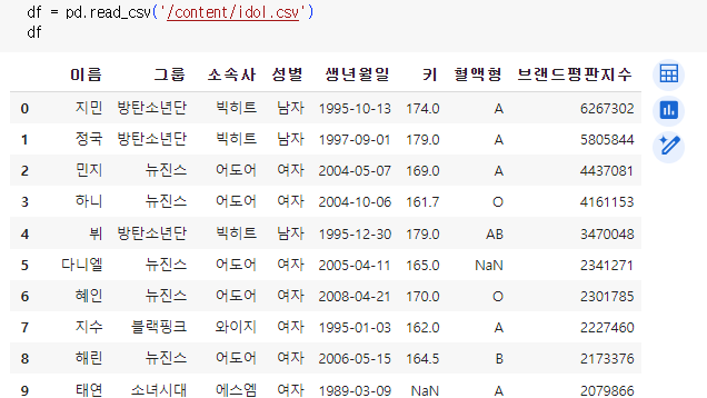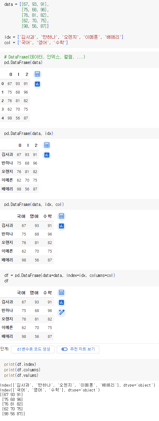 - 데이터프레임의 각 요소는 인덱스(index), 열(column), 값(value)으로 구성되어 있음