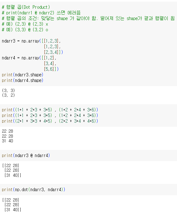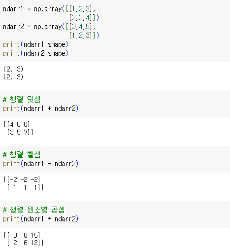 - 넘파이에서는 다차원 배열인 ndarray를 사용하여 행렬 연산을 수행