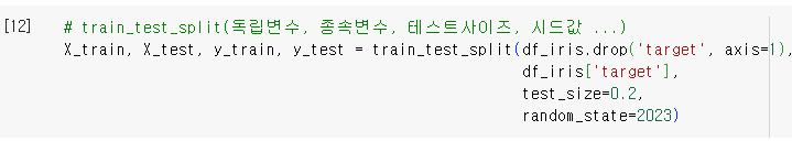 # train_test_split(독립변수, 종속변수, 테스트사이즈, 시드값 ...)