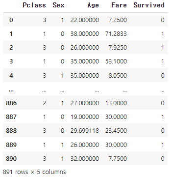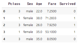 columns = ['Pclass', 'Sex', 'Age', 'Fare', 'Survived']