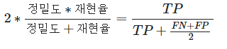 - 정밀도와 재현율의 조화평균을 나타내는 지표