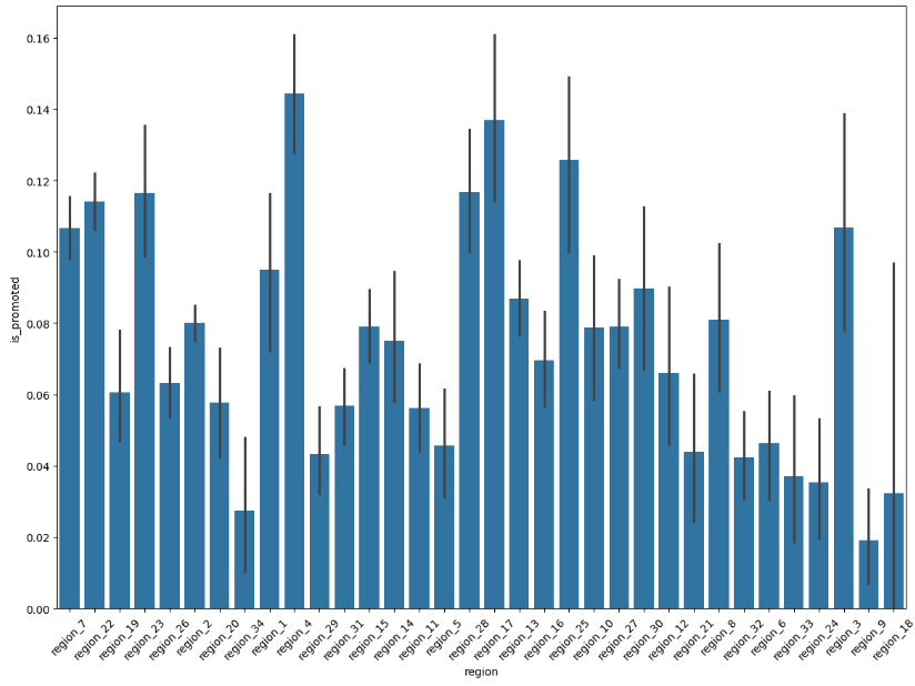 sns.barplot(x='region', y='is_promoted', data=hr_df)