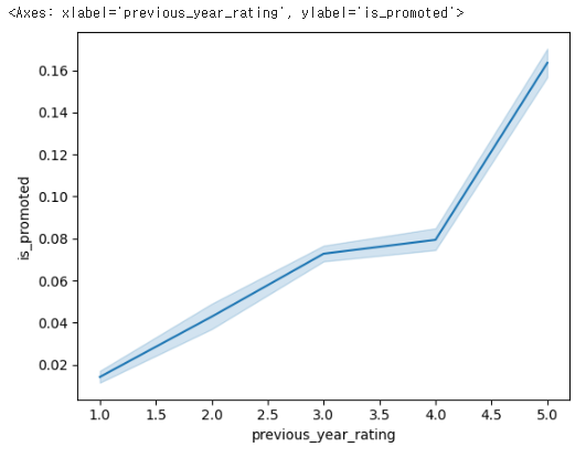 # Seaborn 라이브러리를 사용하여 이전 연도 평가 점수와 승진 여부 사이의 관계를 나타내는 선 그래프를 만듭니다