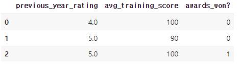tempX = hr_df[['previous_year_rating', 'avg_training_score', 'awards_won?']]