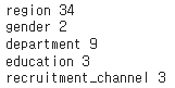 for i in {'department','region','education','gender','recruitment_channel'}: