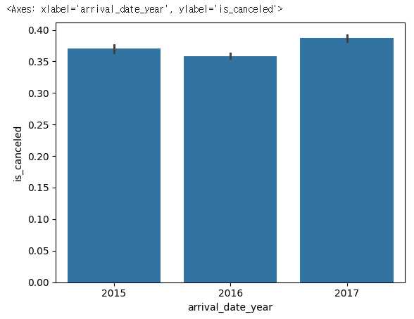 sns.barplot(x=hotel_df['arrival_date_year'], y=hotel_df['is_canceled'])