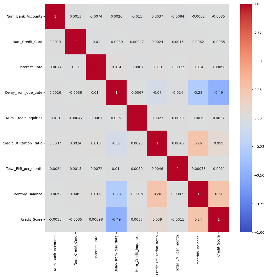 sns.heatmap(credit_df.corr(numeric_only=True), cmap='coolwarm', vmin=-1, vmax=1, annot=True)
