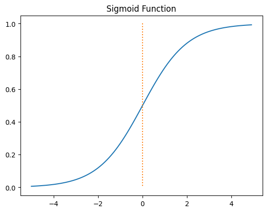 plt.plot([0,0],[5.0,0.0],':') # x,y (0,0) 위치에 y 선으로 0 ~ 1 까지 점선을 그리라는 의미