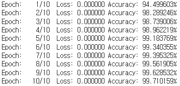 print(f'Epoch: {epoch:4d}/{epochs} Loss: {avg_loss:6f} Accuracy: {avg_acc:2f}%')