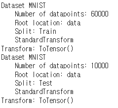 download=True # 데이터셋이 로컬에 없을 경우 인터넷에서 데이터를 자동으로 다운로드