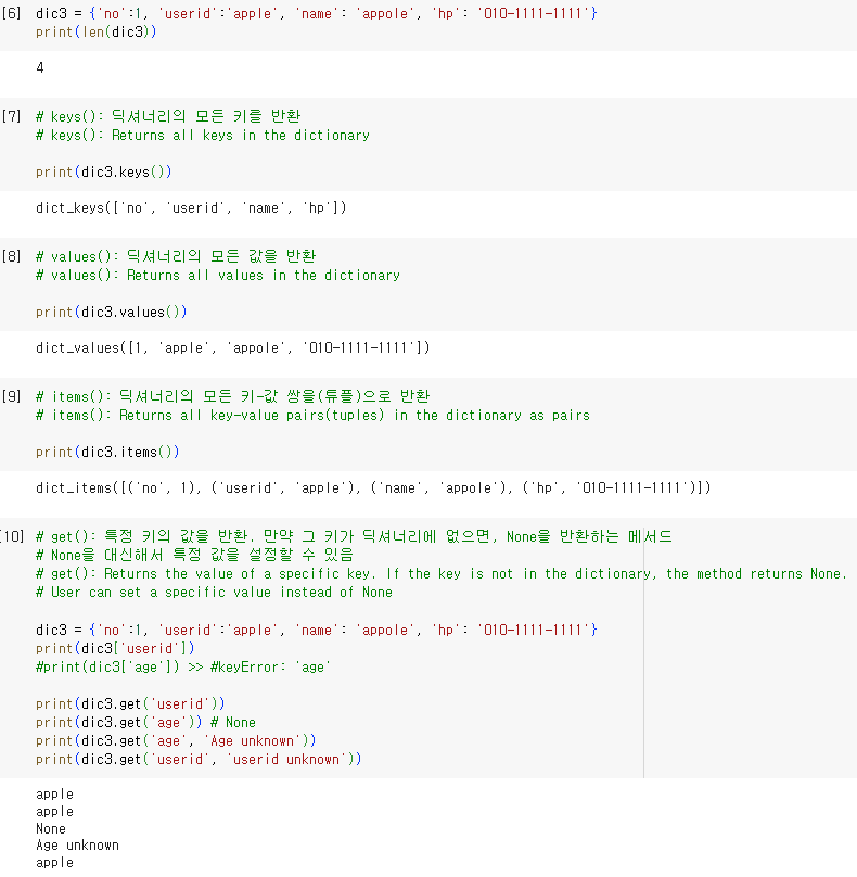 - dict.get(키, 기본값): 키에 해당하는 값을 반환합니다. 키가 없으면 기본값을 반환합니다.