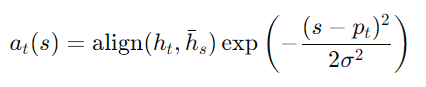 - 컨텍스트 벡터 ctc_t 도출: [pt−D,pt+D] 윈도우 내의 소스 히든 상태 집합에 대한 가중 평균으로 컨텍스트 벡터 ct를 도출합니다. 여기서 는 경험적으로 선택된 값입니다.