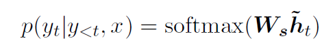 - attentional hidden state: ℎ 𝑡 와 소스 측 컨텍스트 벡터 𝑐 𝑡 를 결합하여 attention 히든상태 ˜ht 를 생성합니다.