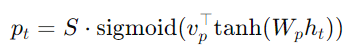 여기서 Wp와 Vp는 모델 파라미터로, 소스 문장의 길이 S에 비례하여 예측 위치 Pt가 설정됩니다. 정렬 가중치는 P 주위의 가우시안 분포를 사용해 설정됩니다: