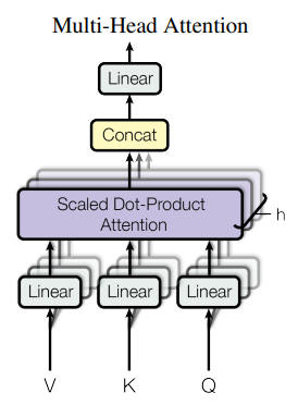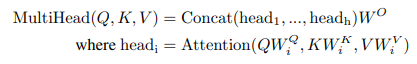 - 각각의 attention 함수에 대해 쿼리(Q), 키(K), 값(V)을 h번 선형 투영하여 사용합니다.