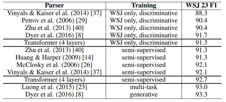 - Transformer가 영어 구문 분석 작업에도 성공적으로 적용되어 다른 작업에도 잘 일반화됨을 보여줍니다.