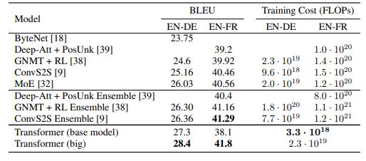 - WMT 2014 영어-독일어 번역 작업에서 28.4 BLEU 점수를 달성하여 기존 최고 결과를 2 BLEU 이상 개선했습니다.
