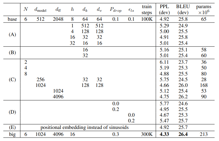 - attention 메커니즘의 구조(헤드 수, 키/값 차원)가 성능에 중요한 영향을 미침