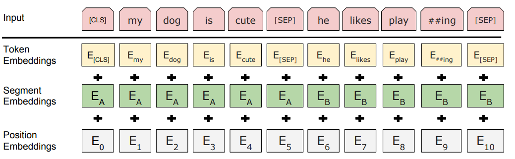 - 각 입력 토큰은 토큰, 세그먼트, 위치 임베딩의 합으로 구성됩니다.
