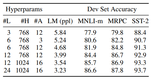 - 다양한 층 수, 은닉 유닛 수, 주의 헤드 수를 가진 BERT 모델들을 훈련