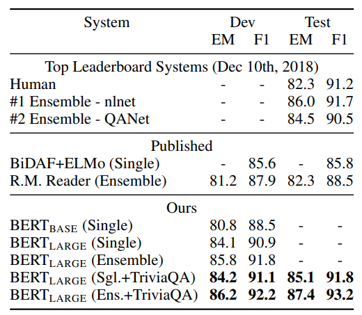 - SQuAD v1.1 질문 답변 테스트 F1 점수를 93.2로 향상 (1.5 포인트 절대 개선)