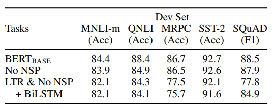 - NSP 제거 시 QNLI, MNLI, SQuAD 1.1에서 성능 현저히 저하