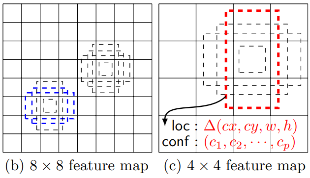 각 m x n 크기의 Feature Map의 Cell에서 k개의 Default Bounding Box를 생성합니다. 이 Box들은 다양한 가로세로 비율과 크기를 가지고 있습니다.