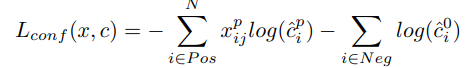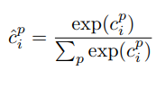 위의 식은 Lconf로 Multi Classes의 Confidence 점수 c에 대한 Softmax Function입니다. c는 다음과 같이 계산됩니다.