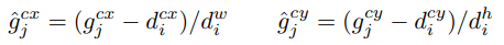 Lloc는 Predicted Box(l)와 Ground-truth Box(g) 사이의 Smooth L1 Function이며, g 파라미터는 다음과 같이 계산됩니다.