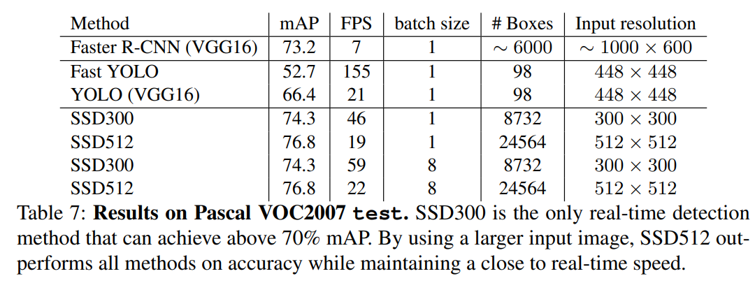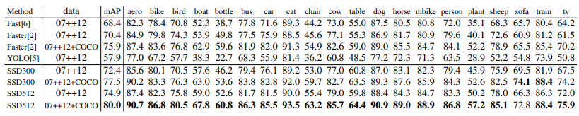 SSD512 모델은 PASCAL VOC와 COCO에서 Faster R-CNN보다 정확도가 높고 3배 빠름