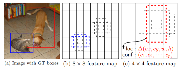 Feature Map과 Default Bounding Box: 입력 이미지(a)를 SSD 모델에 통과시키면, Feature Map과 Default Bounding Box들이 생성됩니다 (b)(c) . 이 때, 여러 개의 Default Bounding Box 중에 특정 조건에 맞는 Default Bounding Box만 찾아서 Ground-truth Box와 매칭 됩니다.