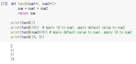 - 매개변수에 기본값을 설정하면, 함수 호출 시 해당 매개변수를 생략해도 됩니다.