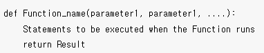 사용자 정의 함수란 사용자가 특정 작업을 수행하기 위해 직접 작성한 함수를 의미합니다. 파이썬에는 많은 내장 함수들이 있지만, 때로는 우리의 요구사항에 맞게 동작하는 함수를 직접 만들어야 할 때가 있습니다. 이때 사용자 정의 함수를 작성하게 됩니다. 기본적인 구조는 아래와 같습니다.