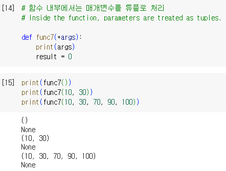 - 함수를 호출할 때 *를 사용하면 시퀀스(리스트, 튜플 등)의 요소를 개별적인 위치 인자로 풀어서 전달할 수 있습니다.