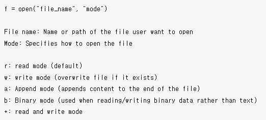 파이썬에서 파일을 열려면 open() 함수를 사용합니다. open() 함수는 두 가지 인수를 받습니다.