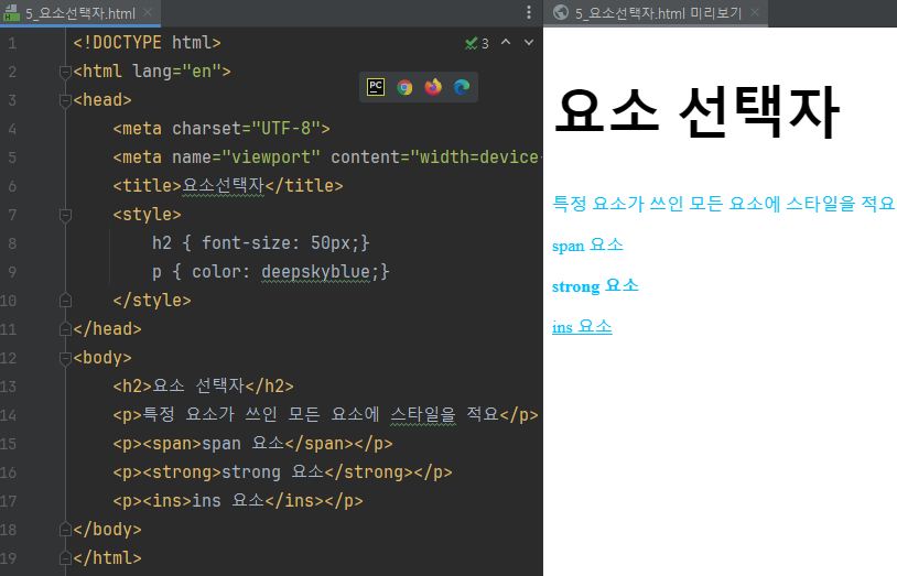<p>특정 요소가 쓰인 모든 요소에 스타일을 적요</p>