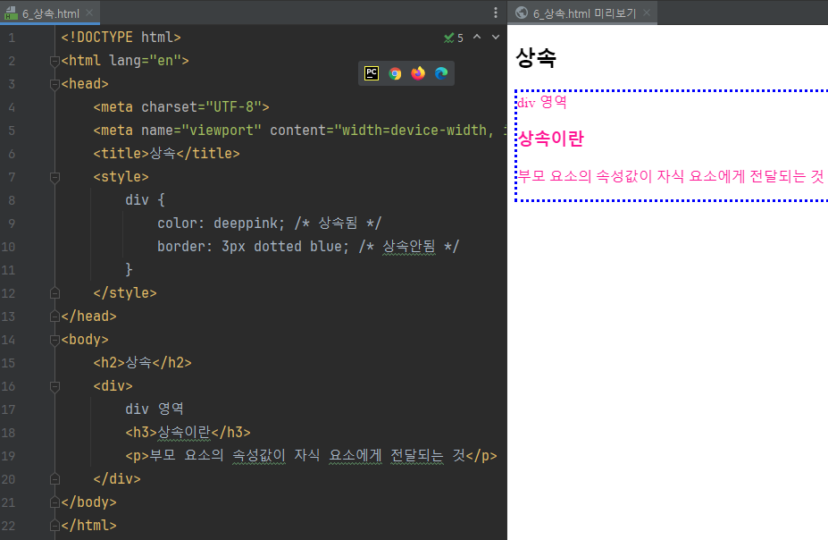 <p>부모 요소의 속성값이 자식 요소에게 전달되는 것</p>