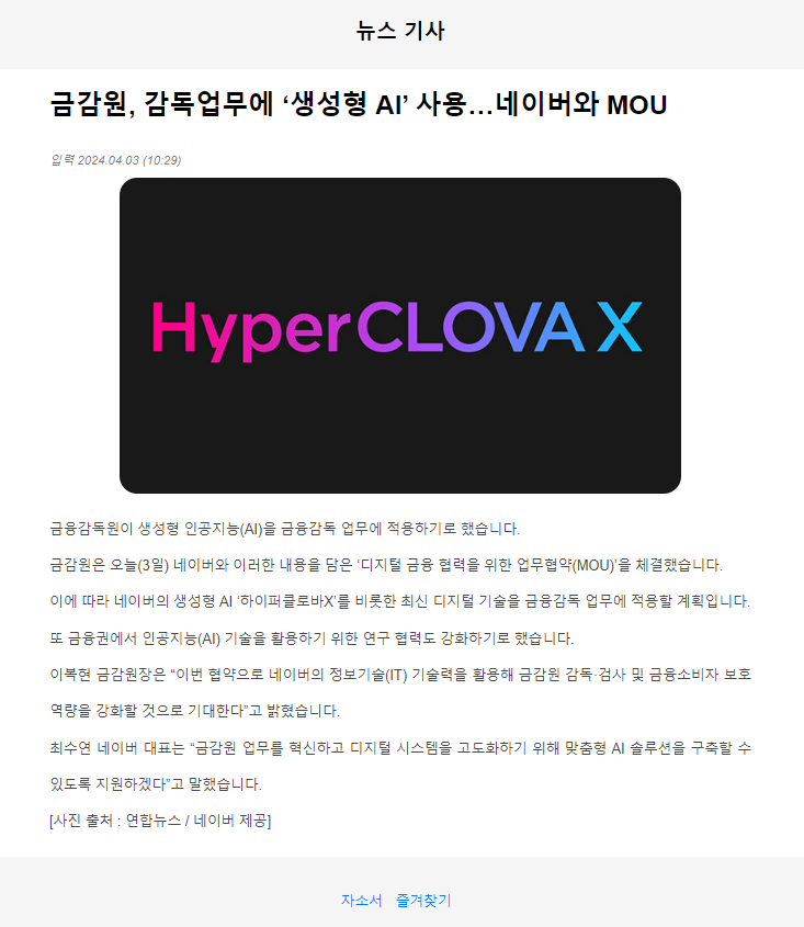 이에 따라 네이버의 생성형 AI ‘하이퍼클로바X’를 비롯한 최신 디지털 기술을 금융감독 업무에 적용할 계획입니다.<br>