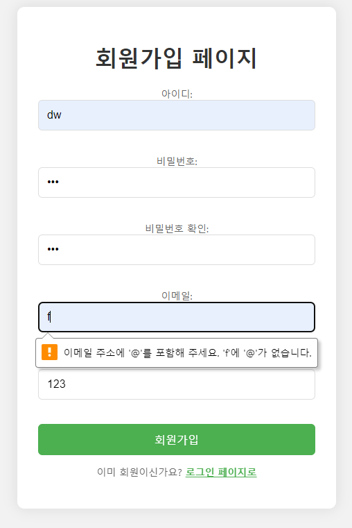 이메일 칸에서는 이메일 형식을 적용하지 않으면 아래와 같이 에러가 뜹니다